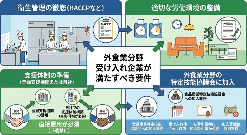 特定技能「宿泊」の外国人材を受け入れる企業は、食品産業特定技能協議会への加入が義務付けられています。この協議会では、特定技能制度の周知や、人手不足の分析を通じて、外国人材の受け入れを円滑にサポートします。