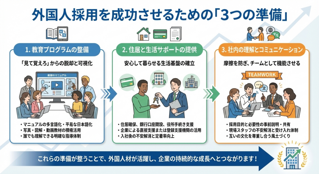 東急バスの事例のように、スムーズな受け入れを行うためには、企業側にも準備が必要です。初めて外国人採用を検討する担当者様は、以下の3点を意識してください。