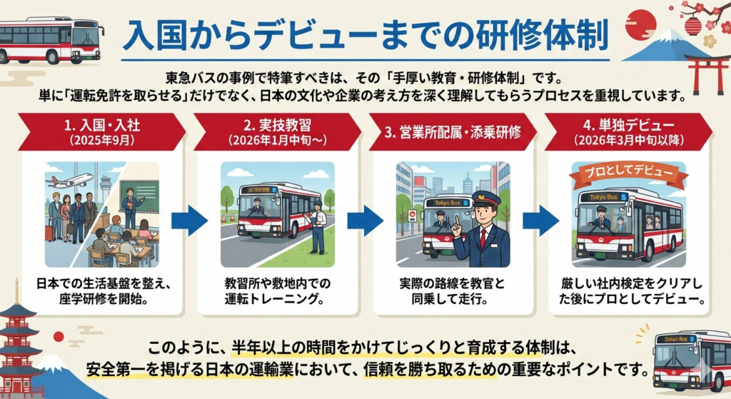東急バスの事例で特筆すべきは、その「手厚い教育・研修体制」です。単に「運転免許を取らせる」だけでなく、日本の文化や企業の考え方を深く理解してもらうプロセスを重視しています。