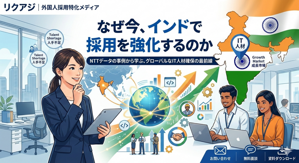 国内のIT人材不足が深刻化する中、日本を代表する企業の動きが注目されています。NTTデータがインドで5,000名もの増員を発表しました。世界規模で進む人材確保の動きは、国内で外国人採用を検討する企業にとっても見逃せない指標です。