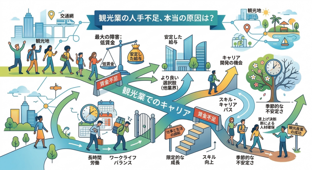 インバウンド需要が回復し、観光産業は再び盛り上がりを見せています。しかし現場では「求人を出しても人が来ない」と悩む企業が後を絶ちません。実はこの人手不足、単なる「労働力不足」ではなく「賃金や待遇」に根本的な原因があります。本記事では、観光業の人手不足の本質を紐解きながら、ピンチをチャンスに変える「賃上げ戦略」と「外国人採用」のポイントをわかりやすく解説します。