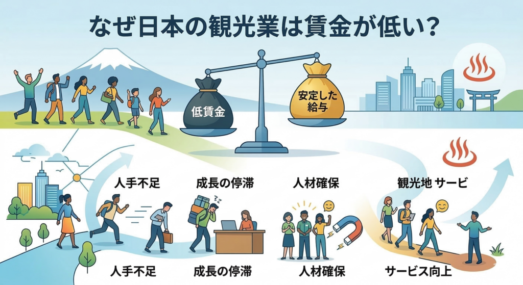 「賃金を上げれば人が来るのはわかるが、現実的に厳しい」と考える経営者や人事担当者は少なくありません。日本の観光業で賃金が上がらない背景には、一時的な景気では説明できない「3つの構造的な要因」が存在します。
