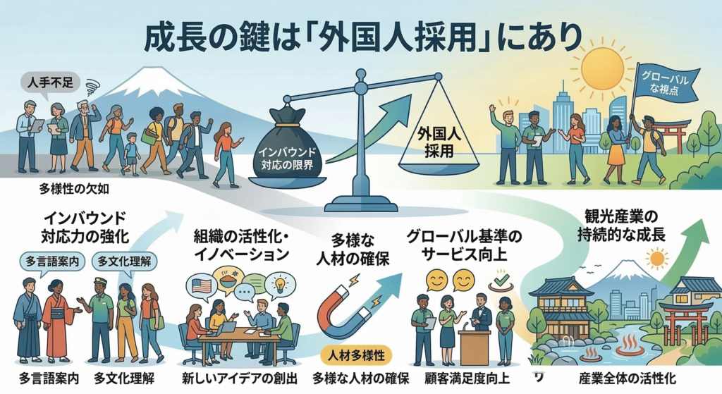 外国人採用には、現在の観光産業が抱える課題を解決する多くのメリットがあります。