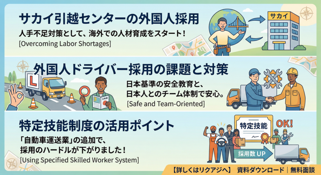 外国人ドライバーの受け入れに対して、多くの企業が「安全性」や「コミュニケーション」に不安を抱えています。サカイ引越センターは、これらの課題に正面から向き合い、「教育」と「品質」という両軸で不安を解消する仕組みを構築しています。